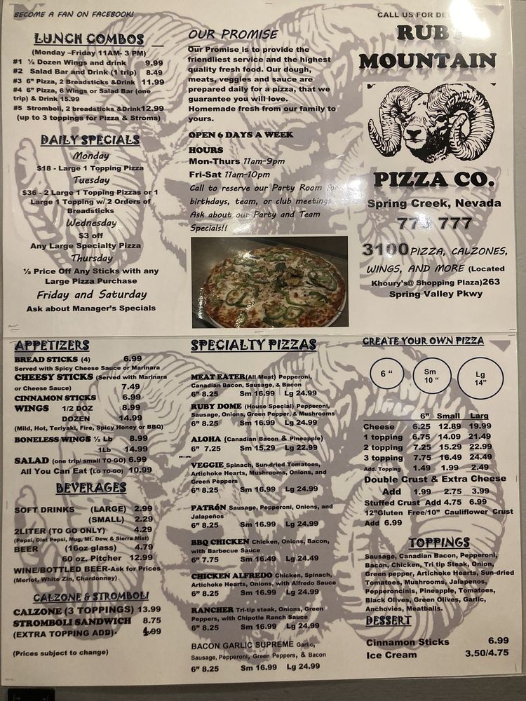 Welcome to Ruby Mountain Pizza Co, a cherished gem located at 263 Spring Valley Pkwy, Spring Creek, NV. This pizza haven delights guests with a mouthwatering menu, including the highly praised cauliflower crust. Diners can indulge in fresh ingredients and a variety of toppings, ensuring there's something for everyone. The restaurant shines with many vegetarian options, great for groups and families alike, and is perfect for all ages.